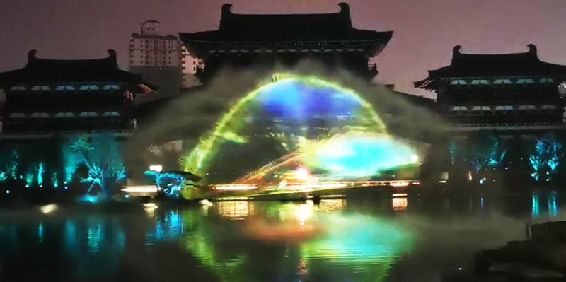 九洲池景區(qū)水幕電影項目,位于洛陽市西工區(qū)定鼎北路與唐宮中路交叉口。水幕高12米,與實景演出結(jié)合,船影水幕漂浮在空中,讓您身處奇幻意境感受著震撼的視聽、夢幻的舞美,一起夢回大唐!